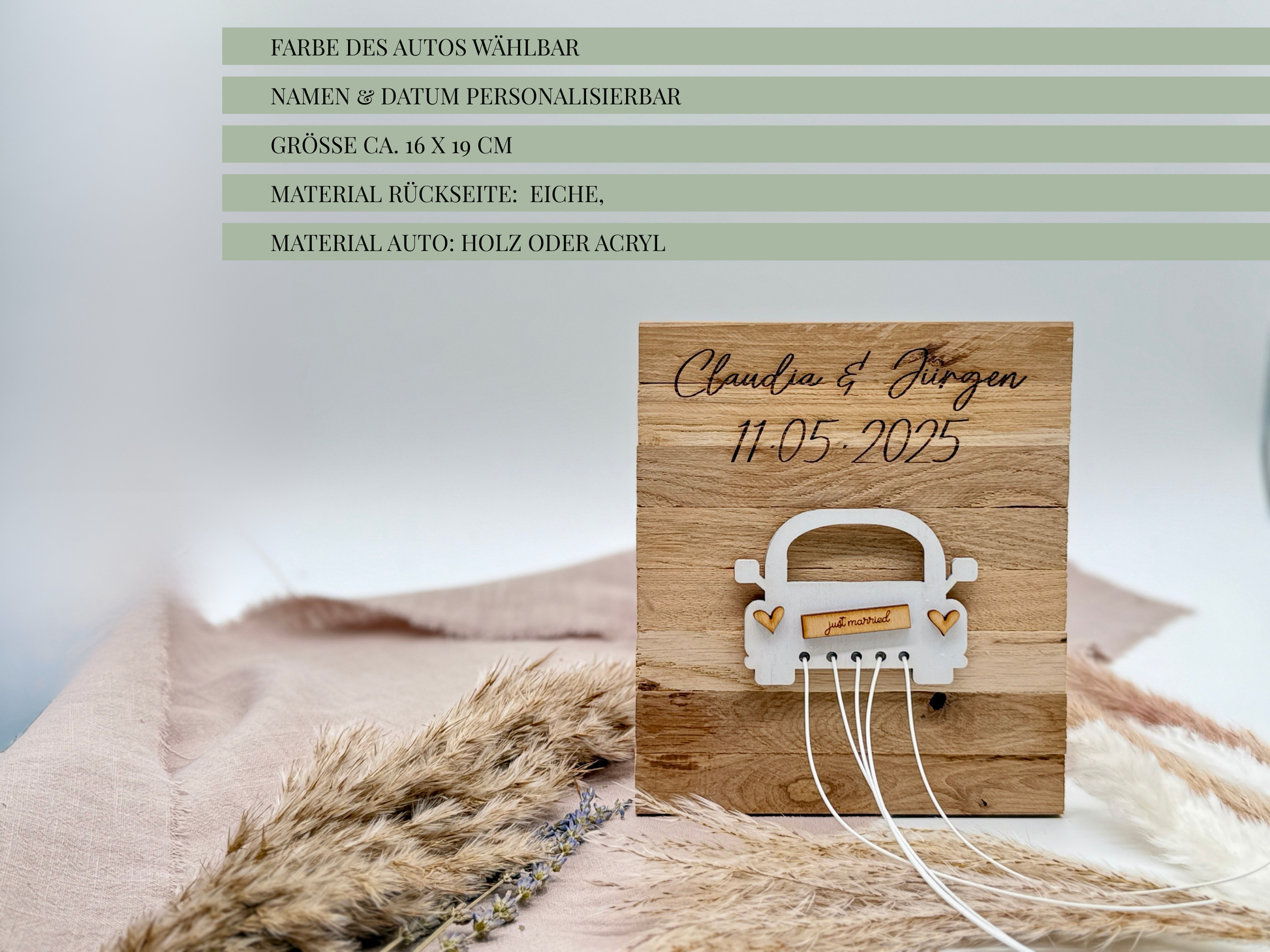 Holzplatte „Hochzeitsauto“ – Personalisiertes Geldgeschenk zur Hochzeit