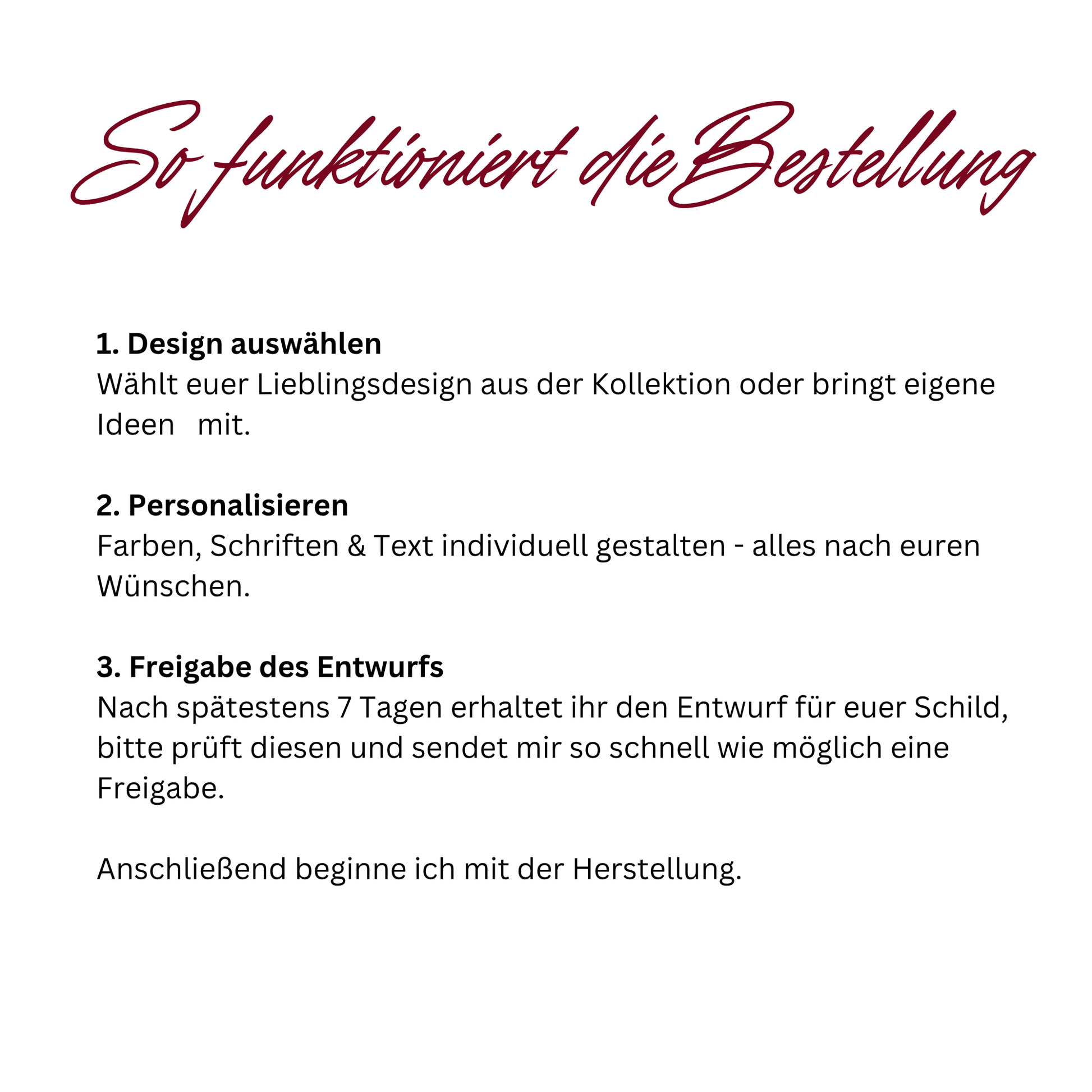 Ihr könnt alle Farben individuell anpassen – Acryl, Folie und 3D-Schrift. So fügt sich euer Schild nahtlos in euer Hochzeitskonzept ein.