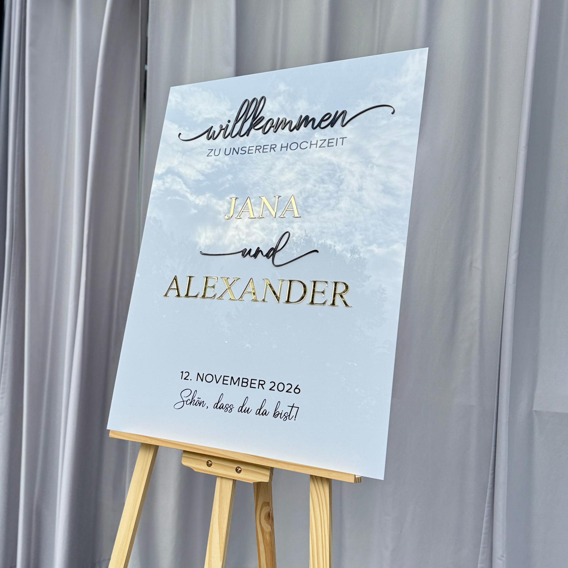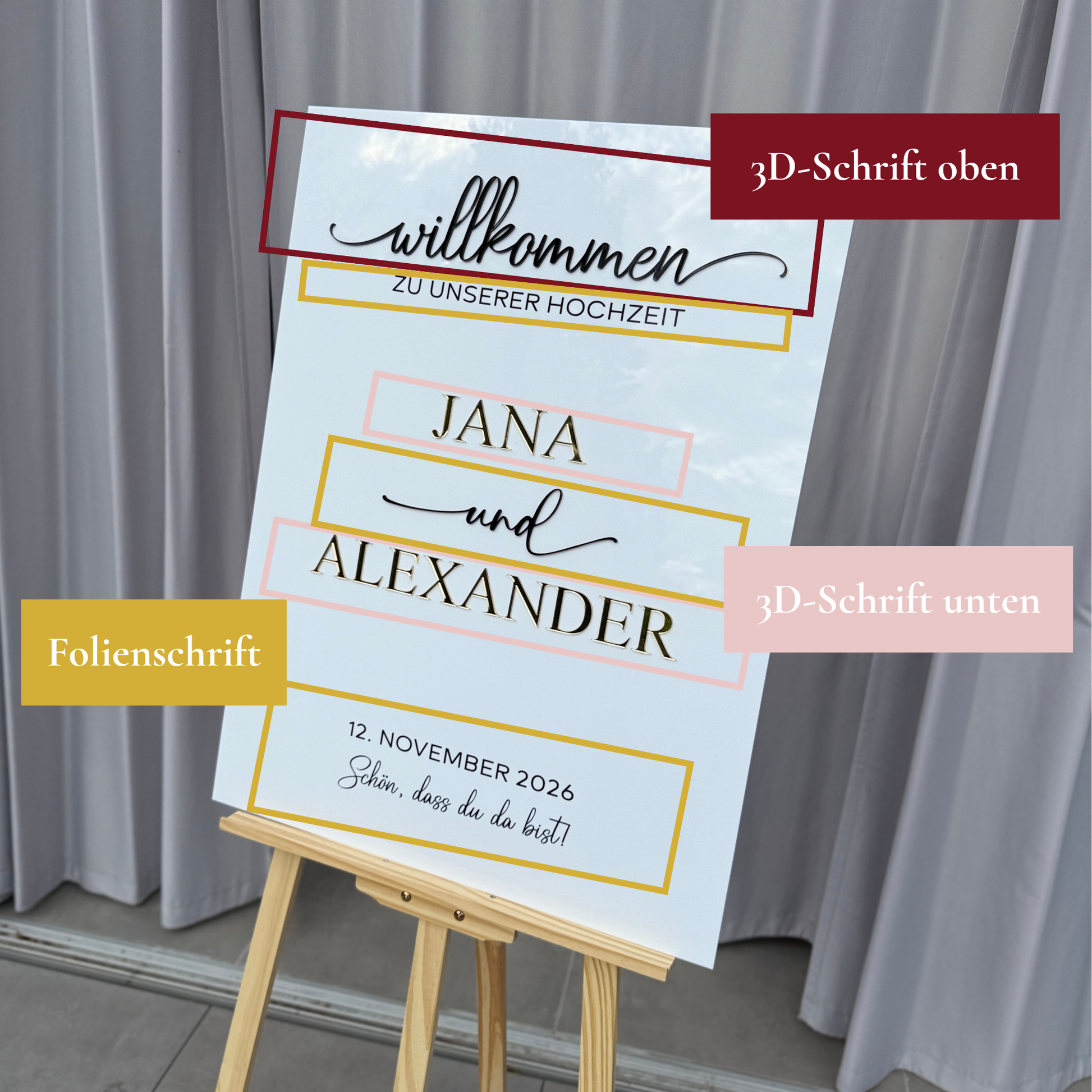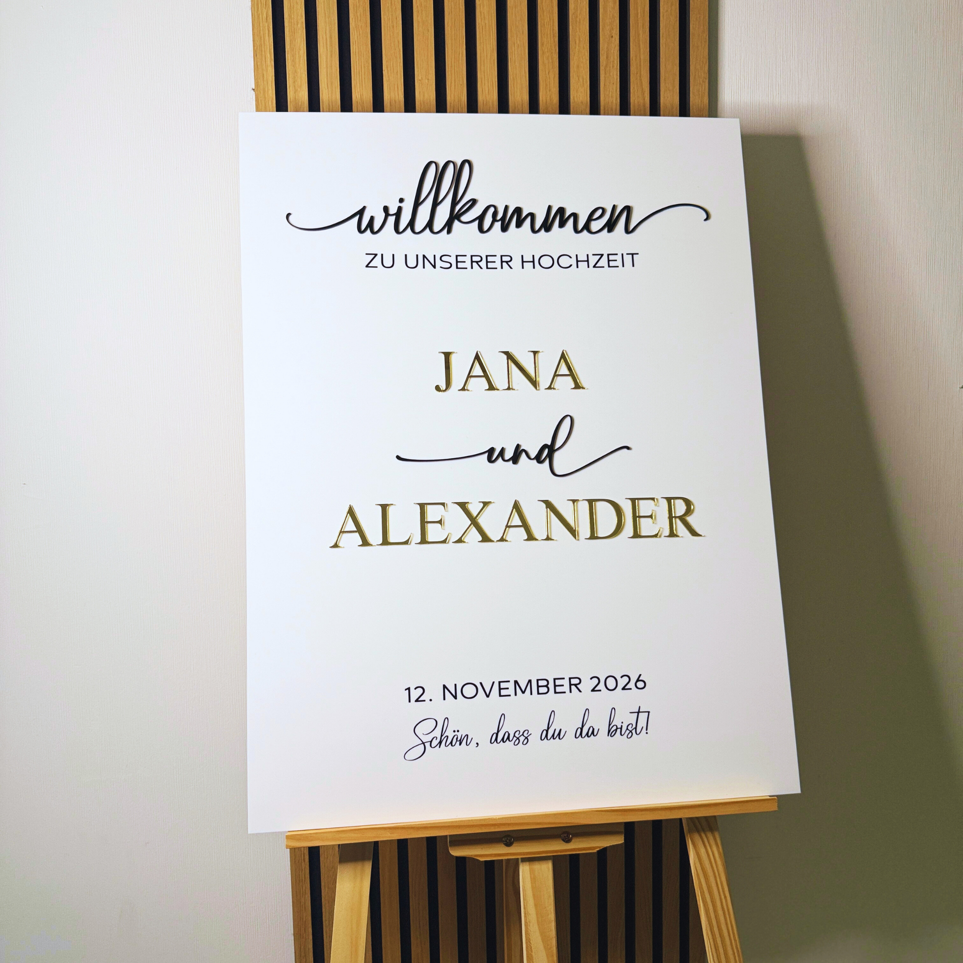 ein weißer Acryl-Hintergrund, darauf edle 3D-Schrift in Schwarz und Gold-Spiegel – ein echter Blickfang für euren Empfang. ✨